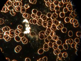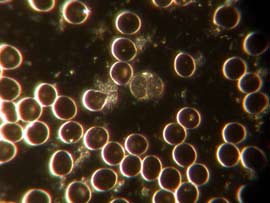 Jeune femme de 25 ans affectée d'un T.O.C. important. Présentation d'un neutrophile émettant de nombreux bourgeons. Ce phénomène est parfois retrouvé dans certaines maladies mentales ; hystérie, épilepsie, mais pas chez les schizophrènes. Aussi et plus régulièrement dans d'autres situations. Il serait imputable à un excès de polyamines circulantes. La thérapie agissant contre ces dernières, le malade se porte nettement mieux. |