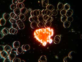 Femme de 39 ans, cancer du sein en rechute, photo prise 19 mois avant. Mitose incomplète d'un lymphocyte (une cellule et deux noyaux). Présentation rencontrée fréquemment chez les sujets porteurs de tumeurs malignes, mais aussi après exposition aux radiations ionisantes et viroses sévères |